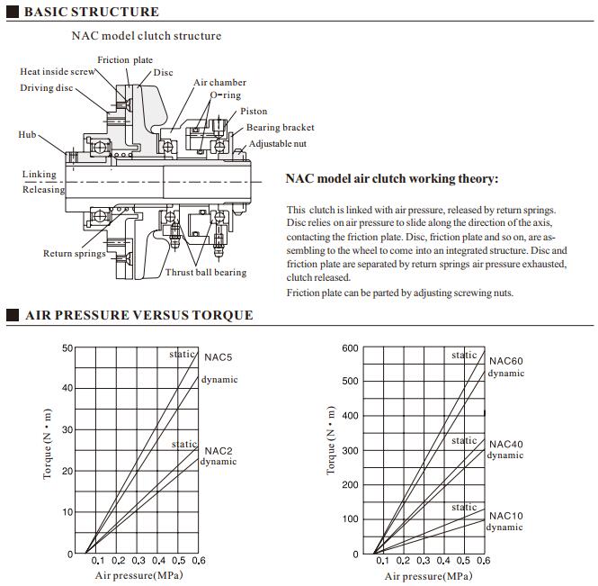 NAC pneumatic-coaxial shaft clutch is standard model air shaft clutch. It used to transmit the torque from driving part to driven part via air pressure. Air pressure as power source is safe and economic for you. Following is the technical data of our NAC pneumatic shaft clutch for your reference: This NAC model air shaft friction plate clutch can replace Korea HAC HDC air clutch, ASAHI CSCP,CSMP model friction disc clutch,Steki and NEXEN pneumatic air shaft clutch well. This air shaft clutch is widely used in rubber machine rollers, conveyor, elevator, handling machinery, food machinery, printing machinery, crusher, motor, tire and rubber machinery, packaging machinery, forming machinery, automatic machinery, wire machinery, sheet metal machinery, filling machinery, plywood machinery, medical machinery, stretching wire machinery, fiber machinery, metalworking machinery, pulverizing machinery, tire forming machinery, paper making machinery and etc. |