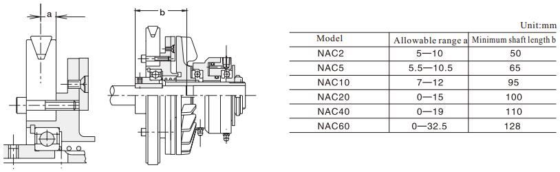 Try to make sure the distance between axial center part of V-belt pulley or chain wheel and end face is during allowable range a.When install clutch onto shaft end, the minimum length of shaft which inserted into inner surface of hub is as below chart.