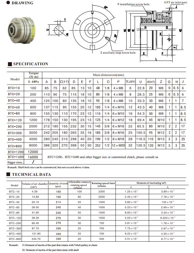 BTC-40 pneumatic tooth clutch is driven by air pressure. Compared with electromagnetic clutch, this pneumatic tooth clutch will not reduce torque and produce spark because of over heat, ensure heavy workload finished. Wide torque control range, it is most suitable work as a tension controller. Controlled by air pressure, soft start and stop. Through clutch operation, adjustment, stable engagement, so make full braking performance. Simple structure, easy maintenance and long service life.