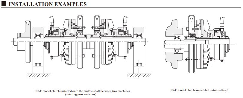 This NAC model air shaft friction plate clutch can replace HDC model friction disc clutch well. This air shaft clutch is widely used in rubber machine rollers, conveyor, elevator, handling machinery, food machinery, printing machinery, crusher, motor, tire and rubber machinery, packaging machinery, forming machinery, automatic machinery, wire machinery, sheet metal machinery, filling machinery, plywood machinery, medical machinery, stretching wire machinery, fiber machinery, metalworking machinery, pulverizing machinery, tire forming machinery, paper making machinery and etc.