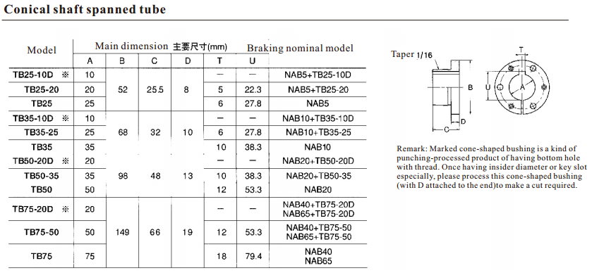 NAB model (standard model) air shaft disc brake equipped cone-shape bushing with wedge to mounted onto shaft. Two-cut type lining can be replaced keeping mechanical structure complete. It reduced heat generated from friction by cooling plate mounted on disc with hub. Friction plate is two-cut style, using screwdriver to take out head inside screw through hole of disc with hub, in order to replace friction plate.
