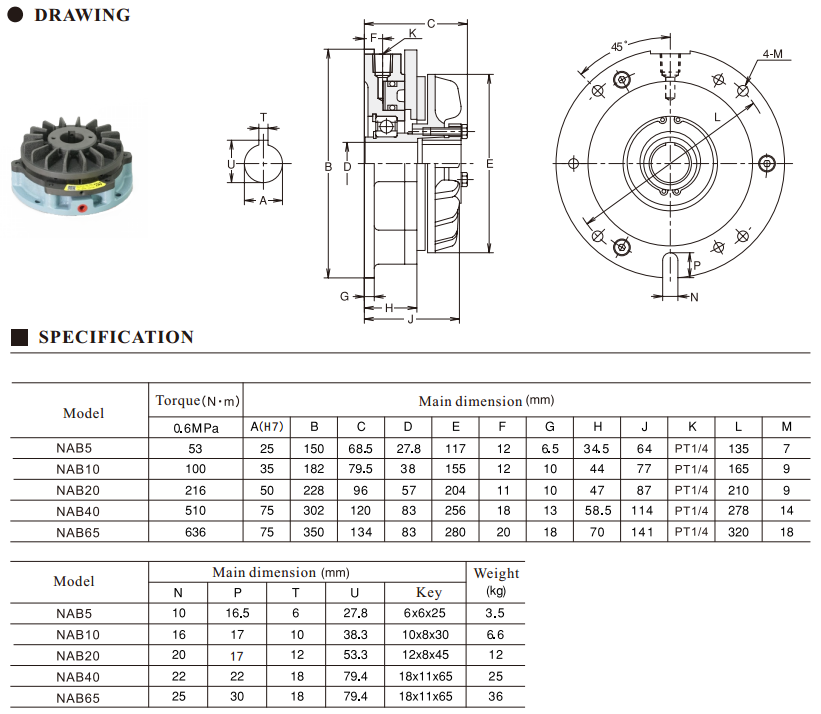 NAB model brake relies on air pressure to brake, return springs to release. After supplying air pressure, piston pushes piston aircraft and friction plate move towards to and compressed shaft attached lining disc, disc and other rotating parts stopped, brake braked. After exhausting air pressure, piston aircraft and friction plate are separated with shaft attached lining disc by return springs, brak released. It reduced heat generated from friction by cooling plate mounted on disc with hub. Friction plate is two-cut style, using screwdriver to take out head inside screw through hole of disc with hub, in order to replace friction plate.