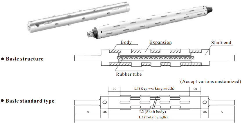 According to its material, this pneumatic expandable shaft can be divided into steel and aluminum two modes.